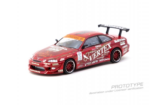 Finished in bright red with detailed graphics, this diecast showcases the full Vertex Ridge TE3005 widebody kit and authentic sponsor markings. It also comes with exclusive collectible trading cards, making it a centerpiece for any serious Vertex or D1GP collector.