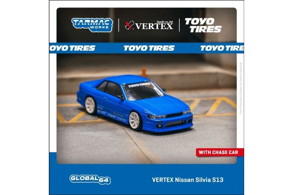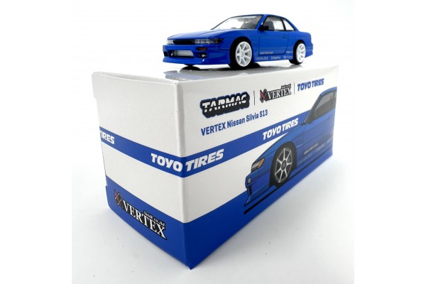 Introducing the Tarmac Works x Vertex x Toyo Tires Nissan S13 (Blue Metallic) diecast collectible 1/64 scale model car – the ultimate addition to any car enthusiast's collection!